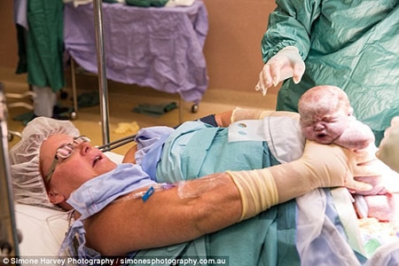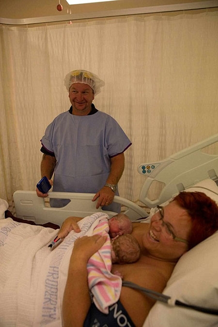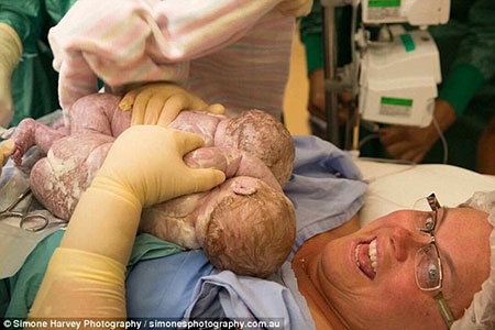 Đây là lần thứ 5 Gerri sinh mổ. Nhưng lần này cô muốn một trải nghiệm đặc biệt. Sau khi nhóm bác sĩ mở ổ bụng, cô tự lôi hai đứa con ra. |