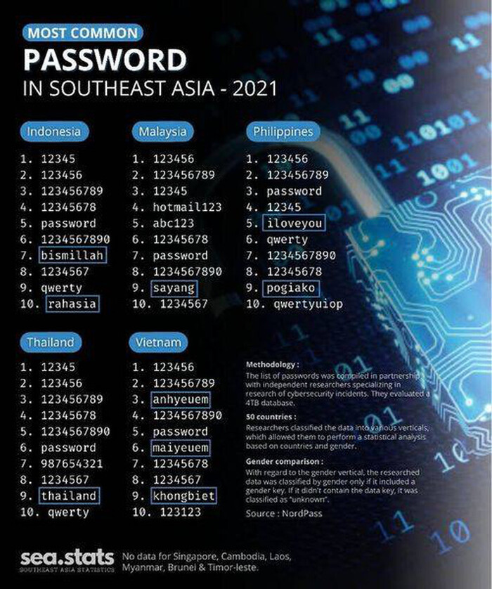 Vào cuối mỗi năm, NordPass - hãng cung cấp công cụ quản lý mật khẩu cùng tên - lại đưa ra danh sách những mật khẩu phổ biến trên thế giới và theo từng khu vực. Dựa trên báo cáo này, trang fanpage Southeast Asia Statistics đã thống kê Top 10 mật khẩu được dùng phổ biến tại các nước Đông Nam Á.