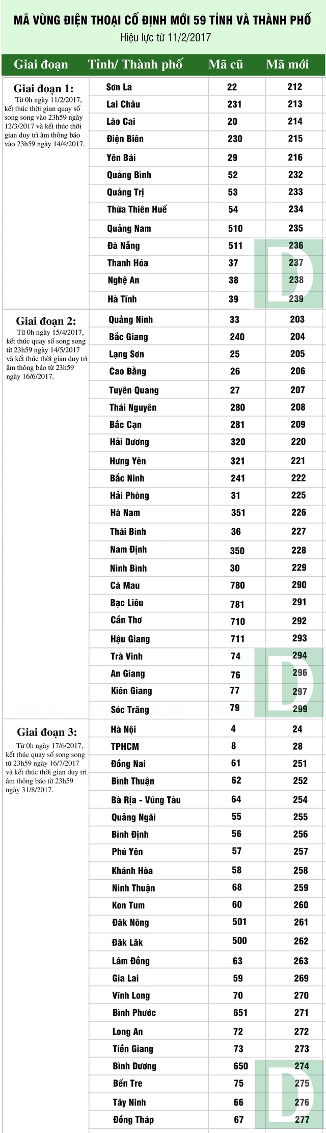 Theo Cục Viễn thông cho biết, lộ trình đổi mã vùng điện thoại cố định đợt này diễn ra ở 59 tỉnh, thành phố trên cả nước. Riêng 4 tỉnh là Vĩnh Phúc, Phú Thọ, Hòa Bình và Hà Giang vẫn giữ nguyên. Kế hoạch chuyển đổi mã vùng sẽ kết thúc vào ngày 31/8/2017.
