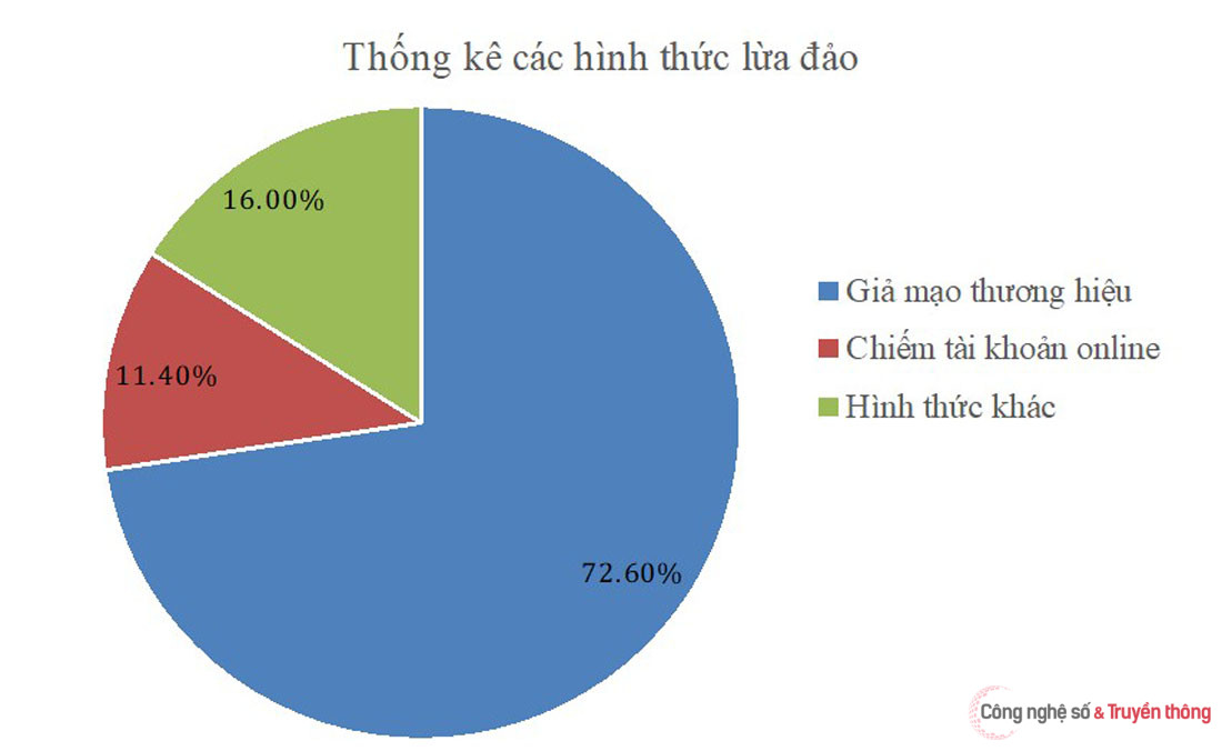 Để thực hiện các cuộc lừa đảo trực tuyến, đối tượng lừa đảo áp dụng nhiều biện pháp khác nhau để tạo niềm tin, nhưng có thể phân ra 3 nhóm lừa đảo chính, đó là giả mạo thương hiệu chiếm 72,6%, chiếm đoạt tài khoản online chiếm 11,4% và 16% còn lại là các hình thức khác như việc làm online, lừa đảo tình cảm, app cho vay...