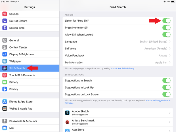 Cài đặt => Siri & Tìm kiếm => tắt Nghe "Hey Siri"