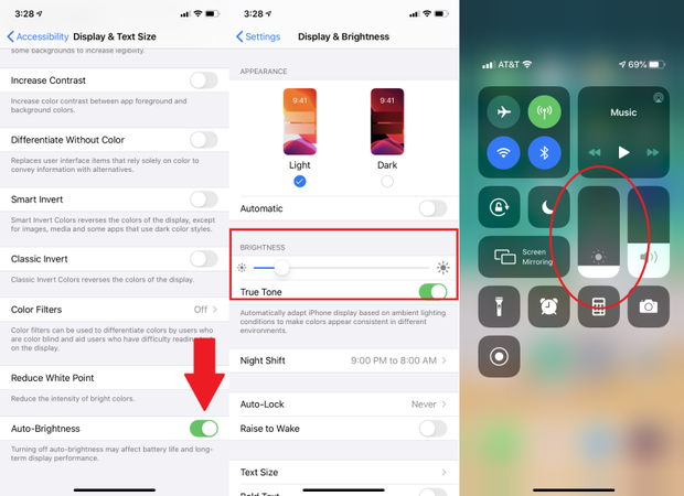 Cài đặt => Trợ năng => Kích thước màn hình & văn bản => Độ sáng tự động và bật nó lên. Bạn cũng có thể điều chỉnh thủ công mức độ sáng trong thông qua Trung tâm điều khiển
