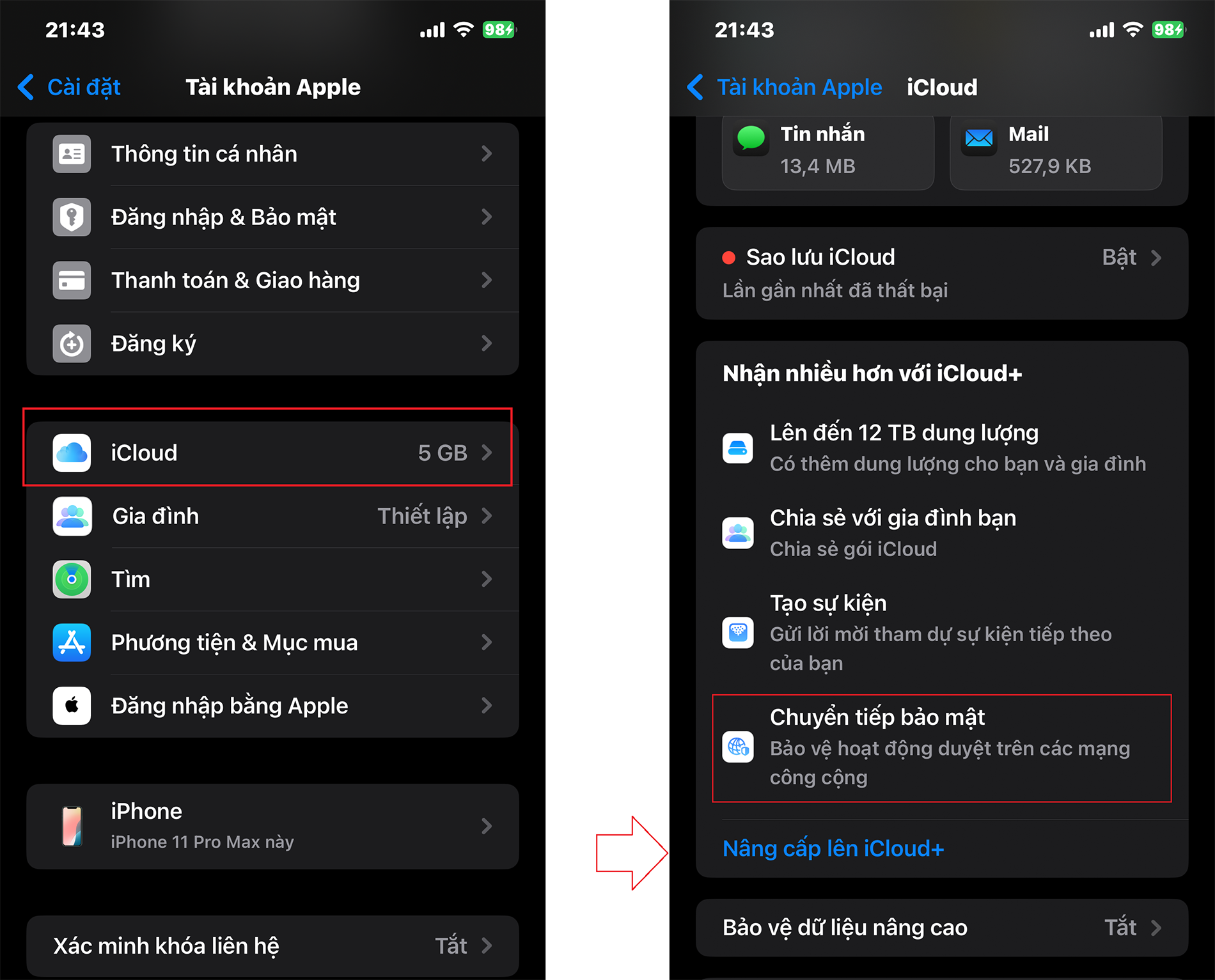 Để cài đặt, bạn vào Cài đặt > Hồ sơ cá nhân > iCloud > Nâng cấp lên iCloud+, rồi chọn Private Relay (Chuyển tiếp bảo mật)