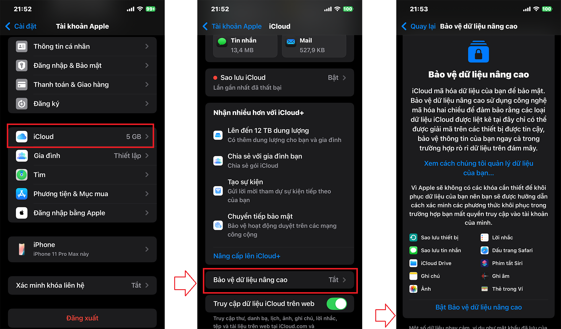 Để cài đặt, bạn vào Cài đặt > Hồ sơ cá nhân > iCloud > Bảo vệ dữ liệu nâng cao (Advanced Data Protection).