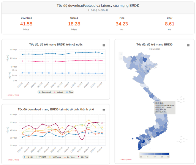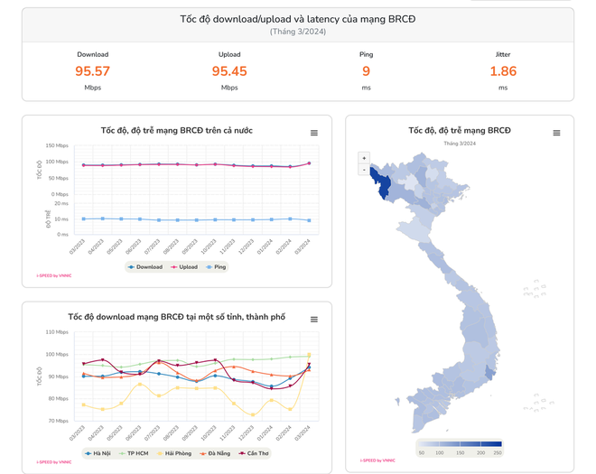 Theo thống kê của VNNIC, tốc độ trung bình của mạng băng rộng cố định tại Việt Nam đạt 95,57 Mb/s khi download và 95,45 Mb/s khi upload.