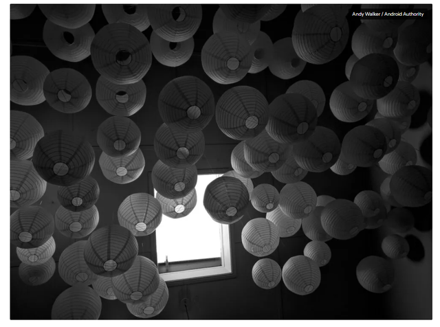 Ngay cả shot chụp bầu không khí bên dưới trần nhà hàng được trang trí bằng đèn lồng cũng có nhiều nét đặc trưng. Bức ảnh này khiến tôi ngạc nhiên. Tôi nghĩ nó sẽ tệ, vì được chụp trong nhà với rất ít ánh sáng tự nhiên chiếu qua một cửa sổ nhỏ trong khung hình. Tuy nhiên, nó lại toát lên một vẻ kỳ ảo nhất định.