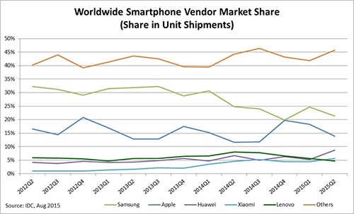 | Thị phần smartphone theo hãng sản xuất từ IDC từ 2012 - 2015. |