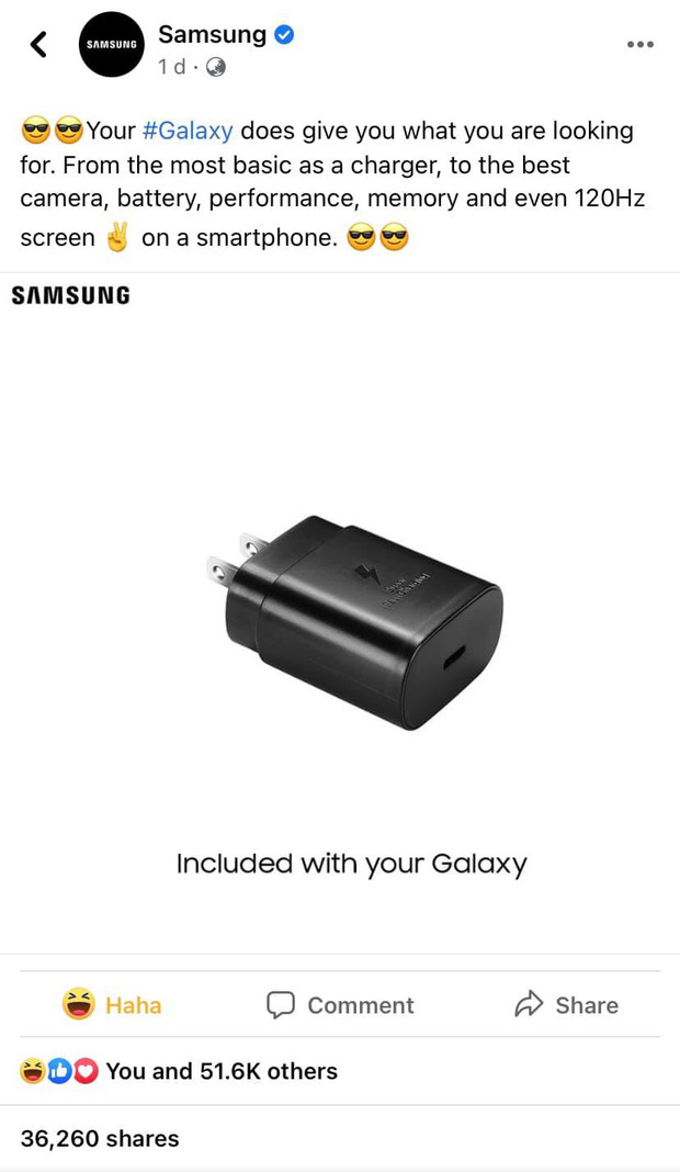 Nguyên văn bài đăng của Samsung như sau, "Những chiếc Galaxy sẽ đưa lại những điều mà bạn đang trông chờ. Không những có cục sạc, chúng tôi đem đến cho người dùng camera đỉnh cao, hiệu năng mạnh mẽ và tất nhiên là màn hình 120Hz nữa", kèm theo đó là hình ảnh củ sạc với chú thích: "Tặng kèm với Samsung Galaxy".