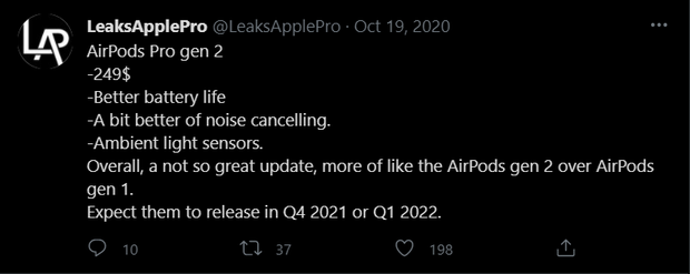 Tài khoản LeaksApplePro đã lên tiếng xác nhận thông tin này và cho biết thế hệ AirPods Pro mới sẽ chỉ là một bản nâng cấp nhẹ. Trên thực tế, đây là chiếc tai nghe true wireless cao cấp nhất đến từ Apple, vì vậy cũng không thể mong chờ một mức giá dễ chịu hơn được.
