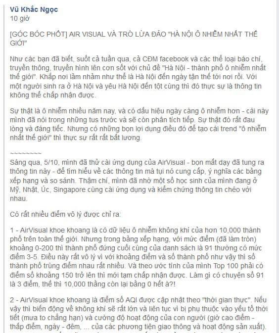 Lược dịch: "Việc tẩy chay đồng loạt xảy ra sau khi người dùng Facebook có tên là Vũ Khắc Ngọc, 1 giáo viên dạy Hóa học online với gần 350 nghìn lượt theo dõi, khẳng định trong 1 bài viết dài rằng Airvisual đã thao túng dữ liệu với mục đích bán máy lọc không khí của công ty mẹ, IQair.