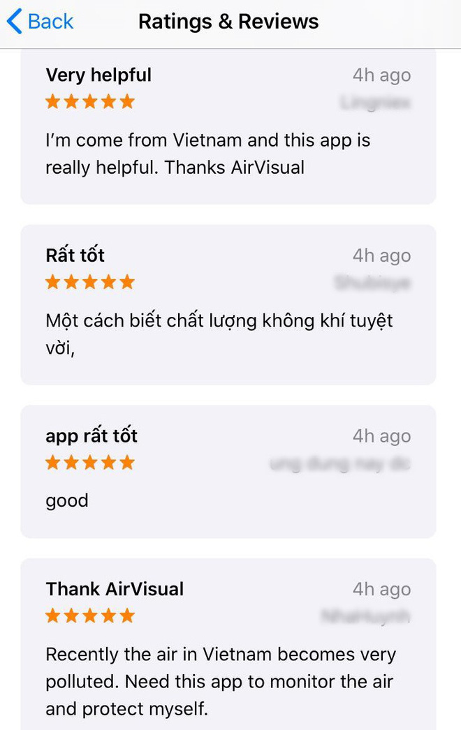 Sau khi sóng gió qua đi, vào ngày 9/10 này, ứng dụng AirVisual đã chính thức quay trở lại trên hai chợ ứng dụng CH Play và Apple Store trong sự vui mừng của người dân Việt Nam. Đã có rất nhiều người người dùng Việt đã cùng nhau rate 5 sao và để lại nhiều bình luận tích cực dành cho ứng dụng này trên chợ ứng dụng của iOS và Android. Đa số các bình luận đều khen ngợi sự hữu ích của AirVisual, hy vọng rằng ứng dụng này sẽ có nhiều cải thiện hơn nữa trong tương lai để nâng cao ý thức của con người về môi trường cũng như có thể tự bảo vệ sức khỏe của bản thân.