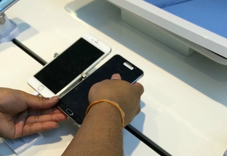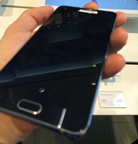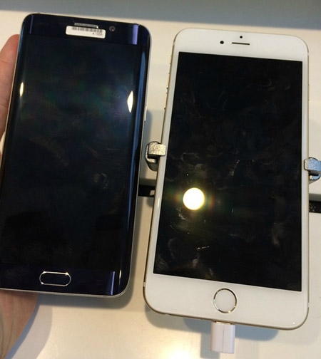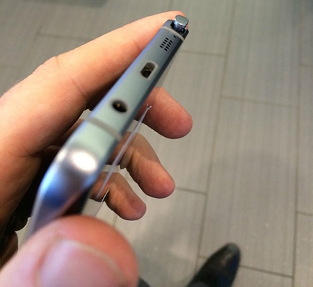 Cùng xuất hiện với Galaxy Note 5 sẽ là mẫu S6 edge Plus, bản phóng lớn của chiếc S6 màn hình cong hai cạnh. Model này được đặt cạnh iPhone 6 Plus cho thấy máy có kích thước tương đương, màn hình rộng 5,7 inch. |