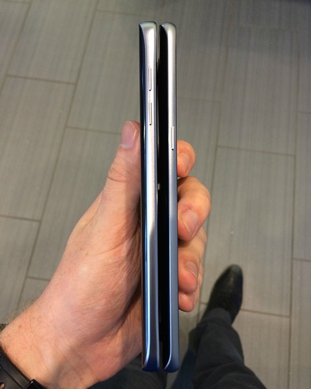 Galaxy Note 5 (trái) so dáng với S6 edge Plus. Phablet có bút S-Pen được đồn mỏng 7,6 mm, còn thiết bị kia là 6,9 mm. Note 5 dày hơn có thể do máy "gánh" viên pin 4.100 mAh, còn S6 edge Plus dùng pin 3.000 mAh. |
