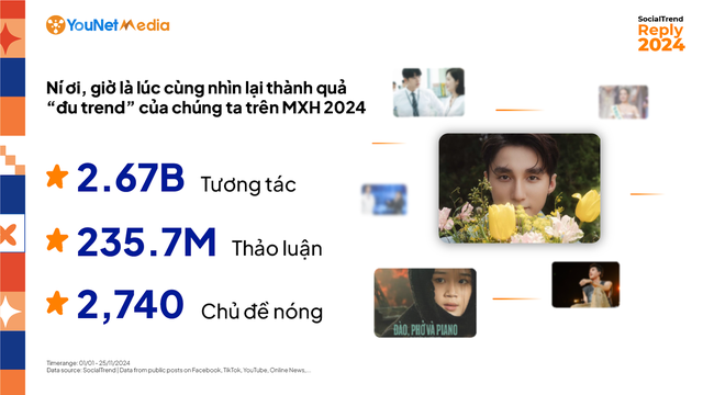 SocialTrend Reply 2024 cho biết] đã có đến 2.740 chủ đề nóng, thu hút hơn 235 triệu lượt thảo luận và hơn 2,67 tỉ lượt tương tác từ người dùng mạng xã hội.
