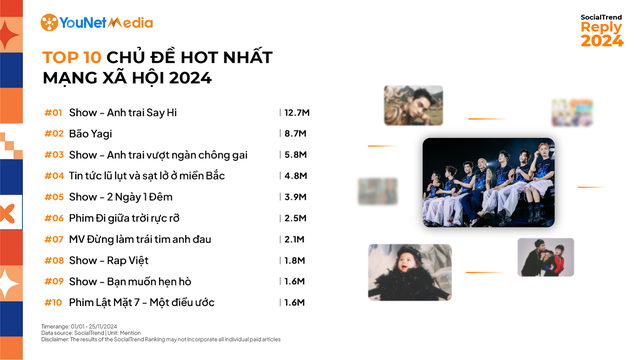 Năm 2024, tốp 10 chủ đề hot nhất mạng xã hội đã tạo ra hơn 945 triệu tương tác và 45,3 triệu thảo luận.