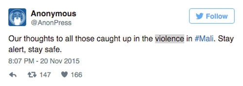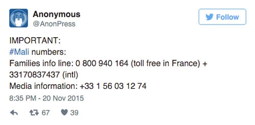 Sau vụ bắt cóc 170 con tin vừa xảy ra tại Mali, tài khoản Twitter @annopress của nhóm Anonymous tiếp tục phát đi thông báo về vụ khủng bố này. Bên cạnh đó, họ còn chia sẻ những số điện thoại để mọi người và thân nhân của các con tin có thể liên hệ khẩn cấp, cùng với lời khuyên mọi người hãy cảnh giác và giữ an toàn.