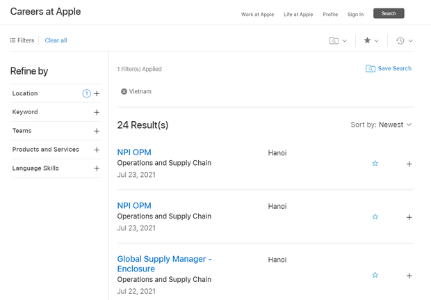 26/07/2021 15:00Apple đăng tin tuyển dụng nhiều vị trí làm việc tại Việt Nam