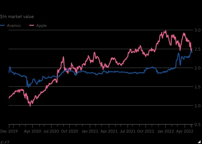 Cổ phiếu Saudi Aramco tăng hơn 27% trong năm 2022. Gã khổng lồ dầu mỏ ghi nhận lợi nhuận năm 2021 tăng gấp đôi do giá dầu tăng mạnh. Apple đoạt ngôi công ty vốn hóa lớn nhất thế giới của chính công ty này vào tháng 7/2020 nhờ kết quả kinh doanh mạnh mẽ. Ngày 31/7/2020, cổ phiếu Apple tăng 10,47%, nâng giá trị vốn hóa lên 1,87 nghìn tỷ USD, cao hơn 1,76 nghìn tỷ USD của Saudi Aramco.