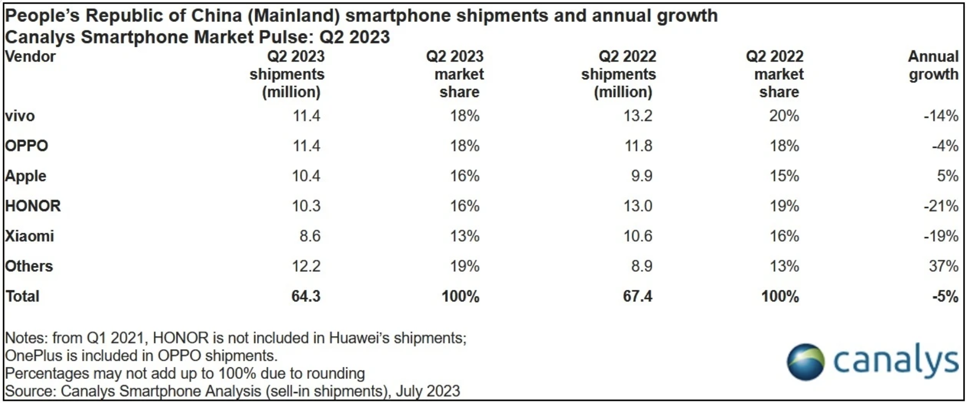 Tiếp theo là Honor có số lượng lô hàng bán ra giảm lên tới 21%, đạt 10,3 triệu chiếc, chiếm 16% thị phần. Ở vị trí thứ 5 là Xiaomi với doanh số bán hàng trong quý 2 giảm 19% so với cùng kỳ năm ngoái, đạt 8,6 triệu chiếc, chiếm 13% thị phần.