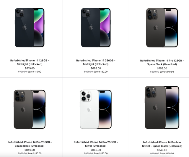 Hôm nay, Apple đã chính thức bổ sung iPhone 14, iPhone 14 Plus, iPhone 14 Pro và iPhone 14 Pro Max tân trang (refurbished) vào cửa hàng trực tuyến chuyên bán các sản phẩm trả lại chính hãng. Đây là lần đầu tiên Apple giảm giá bán đối với các mẫu iPhone thế hệ trước kể từ khi ra mắt vào năm 2022.