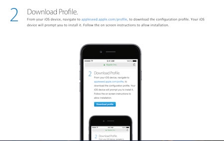 Đây là một phần của chương trình Apple Seed, bạn đọc quan tâm có thể đăng ký tham gia chương trình tại đây. Sau khi đăng ký thành công, Apple sẽ yêu cầu bạn sao lưu lại dữ liệu trên thiết bị của mình bằng iTunes. Bạn sẽ được nhận một profile cấu hình nhằm hiển thị bản cập nhật iOS 8.3 Beta trong phần Software Update để tải về. Tuy nhiên hiện có khá nhiều người dùng đăng ký tham gia chương trình nên bạn sẽ phải chờ vài tiếng hoặc vài ngày để Apple gửi profile về cho bạn.