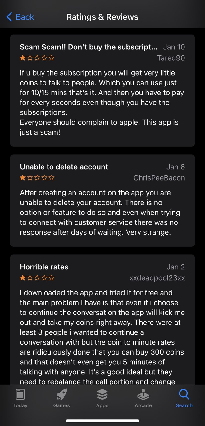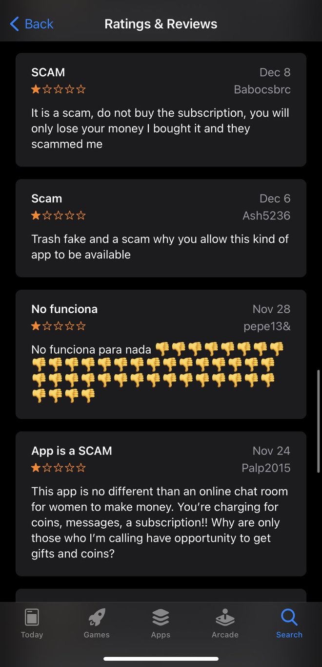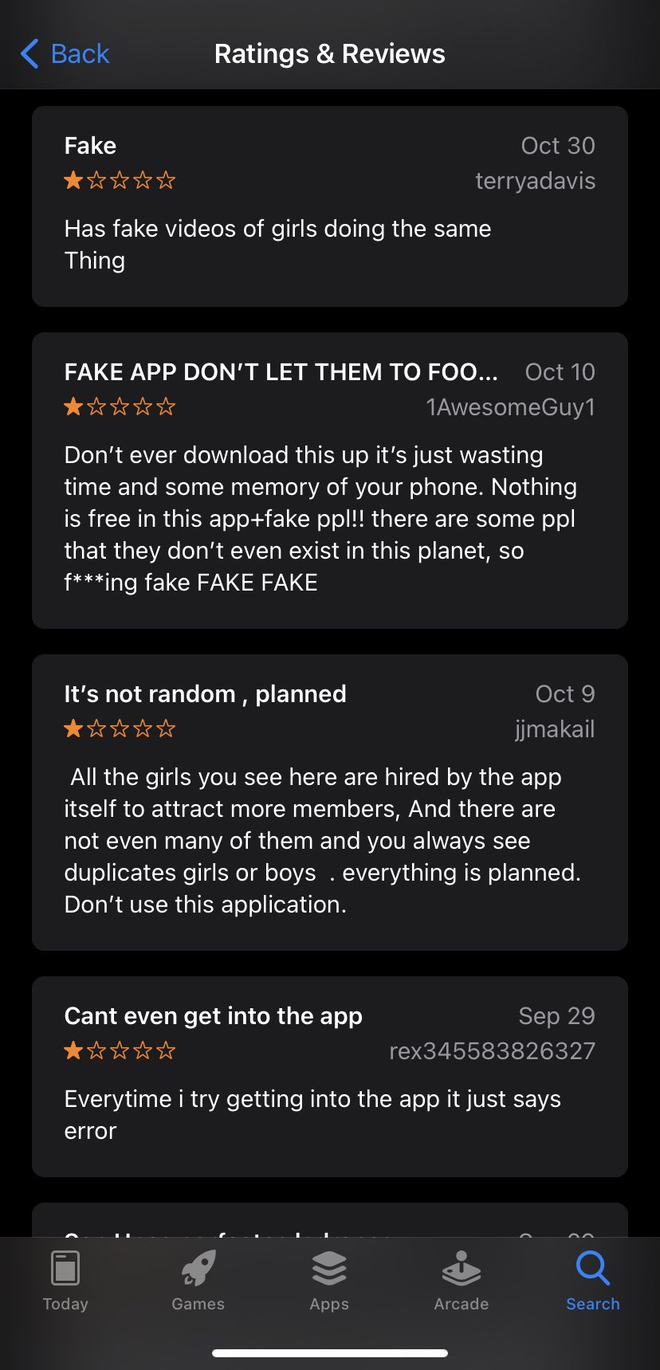 Những ai bị lừa đã đăng bài phàn nàn trong một thời gian dài, nhưng, như mọi khi Apple Support lại không hề quan tâm đến họ. Những người đánh giá ứng dụng trên App Store nói rằng "Các cô gái liên tục yêu cầu bạn gọi điện riêng tư và bắt đầu khỏa thân" và đó là lúc "các tài khoản giả mạo mọc lên như nấm".