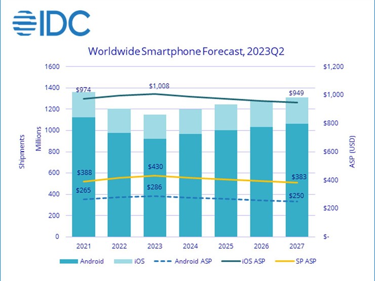 Nabila Popal, giám đốc nghiên cứu nhóm theo dõi thiết bị tiêu dùng và di động của IDC cho biết: “Mặc dù thị trường chắc chắn sẽ tăng trưởng trở lại, nhưng chu kỳ làm mới dài hơn đang làm giảm tốc độ tăng trưởng trong thời gian dài”. Popal tiếp tục: “Khi người tiêu dùng giữ thiết bị của họ lâu hơn, mặt tích cực là họ sẵn sàng trả nhiều tiền hơn, điều này sẽ giúp giá bán trung bình tăng năm thứ tư liên tiếp vào năm 2023”.