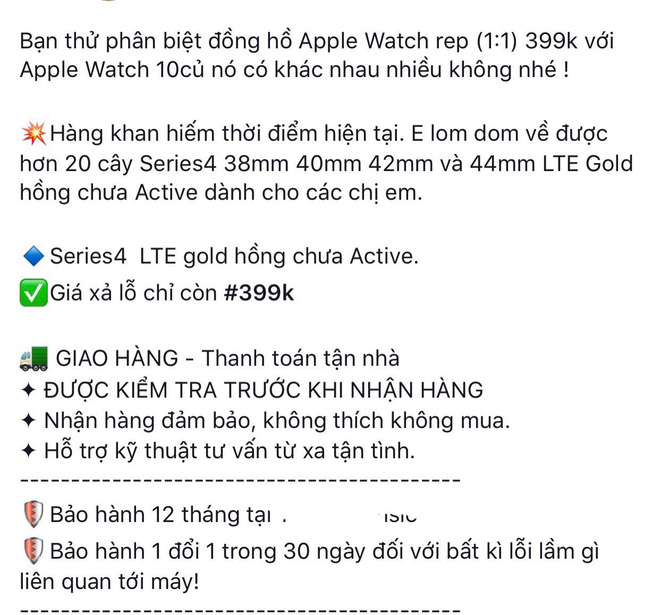 "Tôi vừa đặt mua 1 chiếc đồng hồ thông minh "nhái" Apple Watch, lúc đầu cũng bất ngờ không hiểu sao lại có giá rẻ đến vậy nhưng khi quan sát kĩ mới thấy được sự khác biệt đó là mặt đồng hồ hiển thị không sắc nét, màu đơn điệu và tối hơn so với hàng thật.