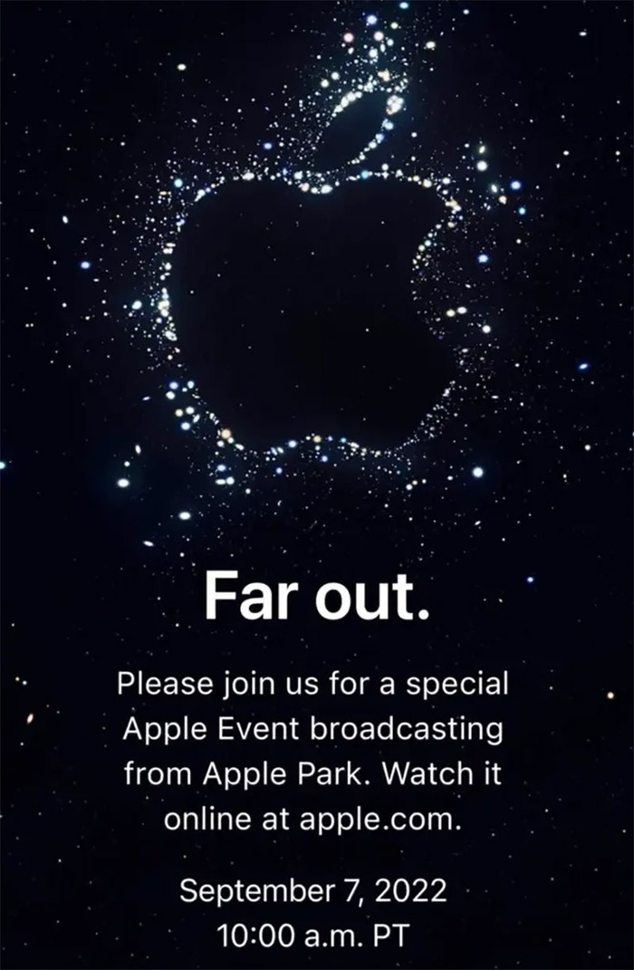 Trong thư gửi giới truyền thông, Apple nhắn kèm thông điệp "Far out". Theo The Verge, việc này có thể ám chỉ một cải tiến lớn của iPhone mới, liên quan đến ống kính tele, hoặc khả năng kết nối vệ tinh được đồn từ khá lâu.