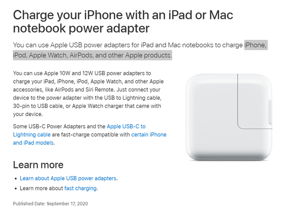 Tuy nhiên, trong một bài viết được đăng tải vào tháng 11/2020, Apple đã khẳng định, người dùng có thể dùng củ sạc của iPad, thậm chí là MacBook để sạc cho các thiết bị Apple khác như iPhone, iPod, Apple Watch, AirPods... Sự tương thích kể trên đến từ việc chiếc iPhone hay các thiết bị cộp mác "Táo Mỹ" khác đều sở hữu trong mình một IC giới hạn dòng điện nằm trên board mạch chủ, nó sẽ tự động điều chỉnh dòng điện đi vào pin sao cho phù hợp với công suất sạc tối đa của thiết bị.