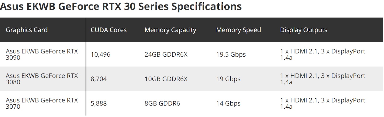 Hiện tại thì ASUS vẫn chưa tiết lộ toàn bộ thông số của card, nhưng theo hình thì ASUS EKWB GeForce RTX 3090 và RTX 3080 sử dụng 2 cổng cắm nguồn 8-pin PCIe, còn ASUS EKWB GeForce RTX 3070 thì có vẻ như vẫn sử dụng đầu 12-pin PCIe giống bản Founders Edition của NVIDIA.