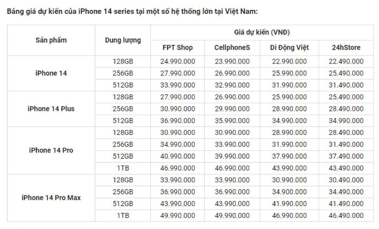 08/09/2022 18:00Bảng giá iPhone 14, iPhone 14 Plus, iPhone 14 Pro và iPhone 14 Pro Max tại Việt Nam
