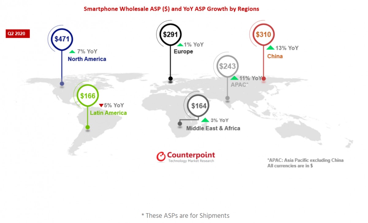Theo ghi nhận của hãng phân tích, mức tăng ASP cao nhất so với toàn cầu thuộc về Trung Quốc, nơi giá bán trung bình của smartphone dao động quanh mức 310 USD. Trong khi đó, Bắc Mỹ có giá bán bình quân tăng 7% so với cùng kỳ năm trước, khoảng 471 USD cho một chiếc điện thoại. Đồng thời đây cũng là nơi có giá bán cao nhất so với bất kỳ thị trường nào khác. Trong khi đó, thị trường Mỹ Latinh chứng kiến mức giảm 5% ASP so với cùng kỳ, ở mức 166 USD.