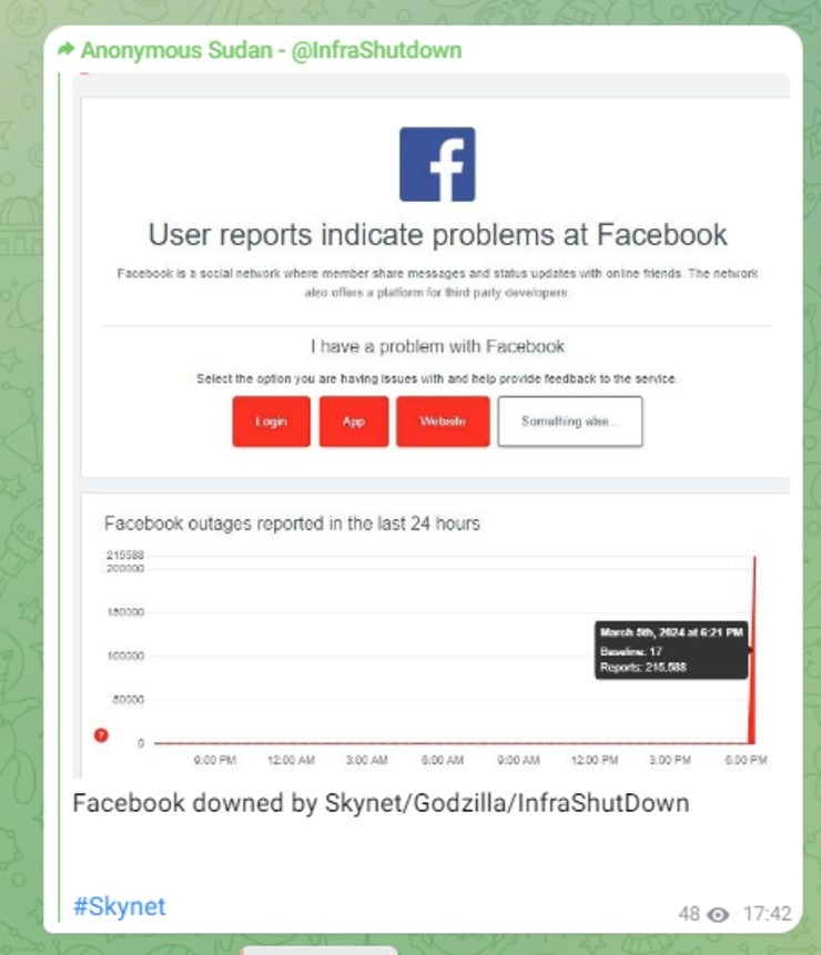 Trong tuyên bố của mình, nhóm hacker có tên Anonymous Sudan cho biết họ đã cùng 2 nhóm hacker khác là Skynet và Godzilla gây ra sự cố đối với máy chủ Meta vào tối 5/3, khiến người dùng tự động đăng xuất khỏi dịch vụ và hiển thị thông báo đã hết hạn phiên đăng nhập. Sau đó, người dùng cũng không thể đăng nhập lại.