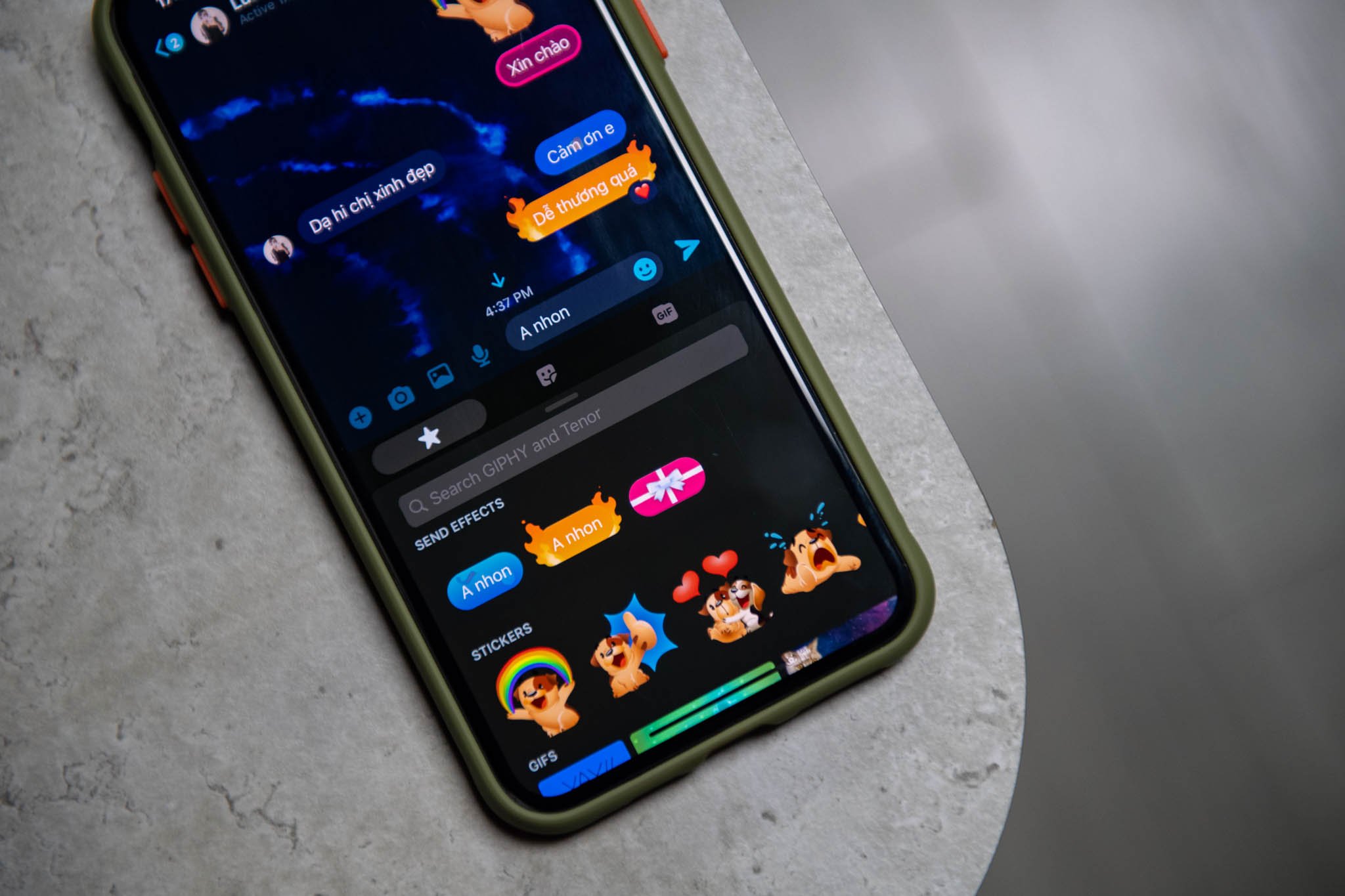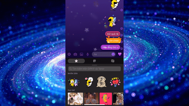 Soạn thảo một đoạn hội thoại bất kỳ vào khung chat. Trước khi gửi tin nhắn, bấm vào hình mặt cười ngay bên cạnh nút gửi. Khi đó bạn sẽ thấy 3 hiệu ứng mới xuất hiện bên dưới kèm theo đoạn hội thoại mà bạn vừa soạn thảo. Chọn một hiệu ứng mà bạn muốn nó xuất hiện, tin nhắn sẽ lập tức được gửi đi với hiệu ứng đó.