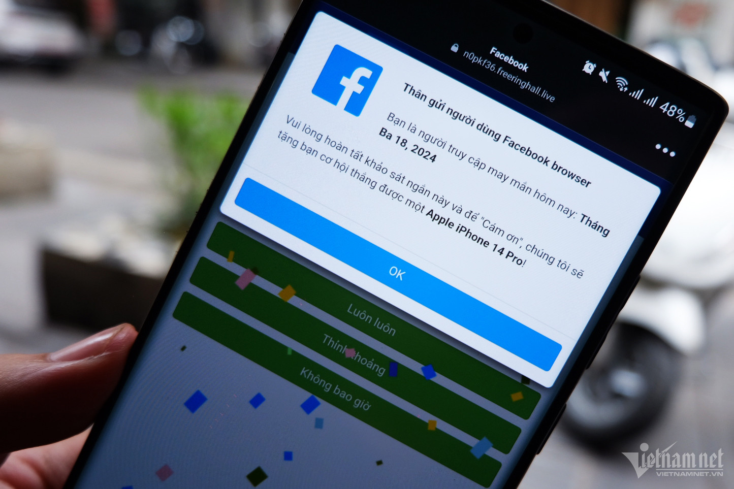 “Từ Facebook, tôi được dẫn đến một trang web lạ có đuôi “.live” thay vì cổng thông tin điện tử của cơ quan chức năng mà tôi muốn truy cập. Một thông báo cũng hiện lên cho biết tôi là người may mắn. Nếu hoàn tất khảo sát, tôi sẽ có thể nhận được chiếc iPhone 14 Pro. Cảm thấy nghi ngờ, tôi không dám ấn tiếp vào link vì sợ nhiễm mã độc”, anh Huy nói.