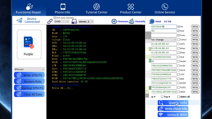 Chỉ cần bỏ ra khoảng 5 triệu đồng, người mua có thể sở hữu một thiết bị có tên iRepare P10 để thay đổi hàng loạt thông số của iPhone, như số Series, mã khu vực, địa chỉ Wi-Fi... mà không cần tháo máy. Trong video được một thợ iPhone đăng tải, thợ chỉ cần chuyển iPhone sang chế độ DFU, kết nối với bộ công cụ iRepare kích thước bằng nửa bàn tay, cắm vào máy tính và chạy phần mềm tương ứng.