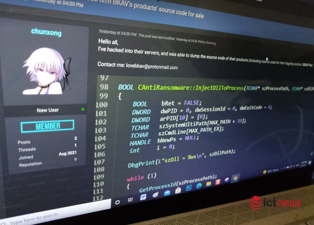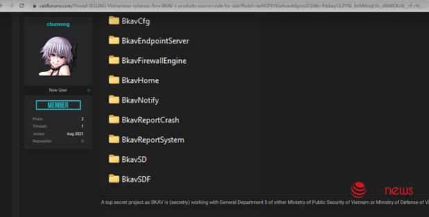 “Tôi đã xâm nhập vào máy chủ của họ và có thể kết xuất mã nguồn của các sản phẩm, bao gồm cả mã nguồn của BKAV Pro”, tài khoản này đăng tải.Ngày 4/8, một tài khoản mới lập có tên chunx**g đã đăng tải trên R***forums - một diễn đàn cho giới hacker - với nội dung rao bán dữ liệu liên quan đến mã nguồn các sản phẩm được cho là của Tập đoàn Bkav. Theo tài khoản này giới thiệu, gói dữ liệu là mã nguồn sản phẩm của Bkav.