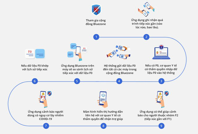 Mặc dù Bluezone không thể phát hiện các ca mắc COVID-19 tuy nhiên có thể giúp phát hiện các trường hợp F1, F2 - là những người có tiếp xúc gần với người mắc COVID-19 -dựa trên cơ chế rà soát nhật ký tiếp xúc của người nhiễm COVID-19, so với nhật ký tiếp túc của những người dùng khác. Nếu xuất hiện các ghi nhận trùng khớp, hệ thống sẽ xác nhận những người đã tiếp xúc, từ đó biết được các F1, F2 tương ứng. Do đó, càng nhiều người cài Bluezone, hiệu quả phát hiện F1, F2 của ứng dụng sẽ càng cao hơn.
