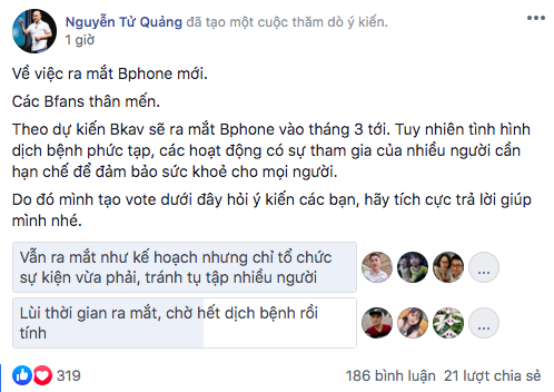Theo dự kiến, Bphone 4 - smartphone mới nhất của Bkav dự kiến sẽ ra mắt vào tháng 3/2020. Tuy nhiên chia sẻ trên fanpage cộng đồng những người dùng Bphone, CEO Bkav Nguyễn Tử Quảng đang trưng cầu ý kiến các thành viên về việc hoãn ra mắt sản phẩm trước diễn biến phức tạp của dịch virus Corona.