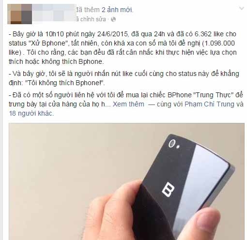 Theo giải thích của thành viên này thì đã qua 24 giờ sau lời kêu gọi được đưa ra nhưng chỉ có 6.362 like cho status "xử Bphone", còn khá xa con số mà anh đưa ra đề nghị (chỉ dần đạt 10% trong số 10.989.000 like).