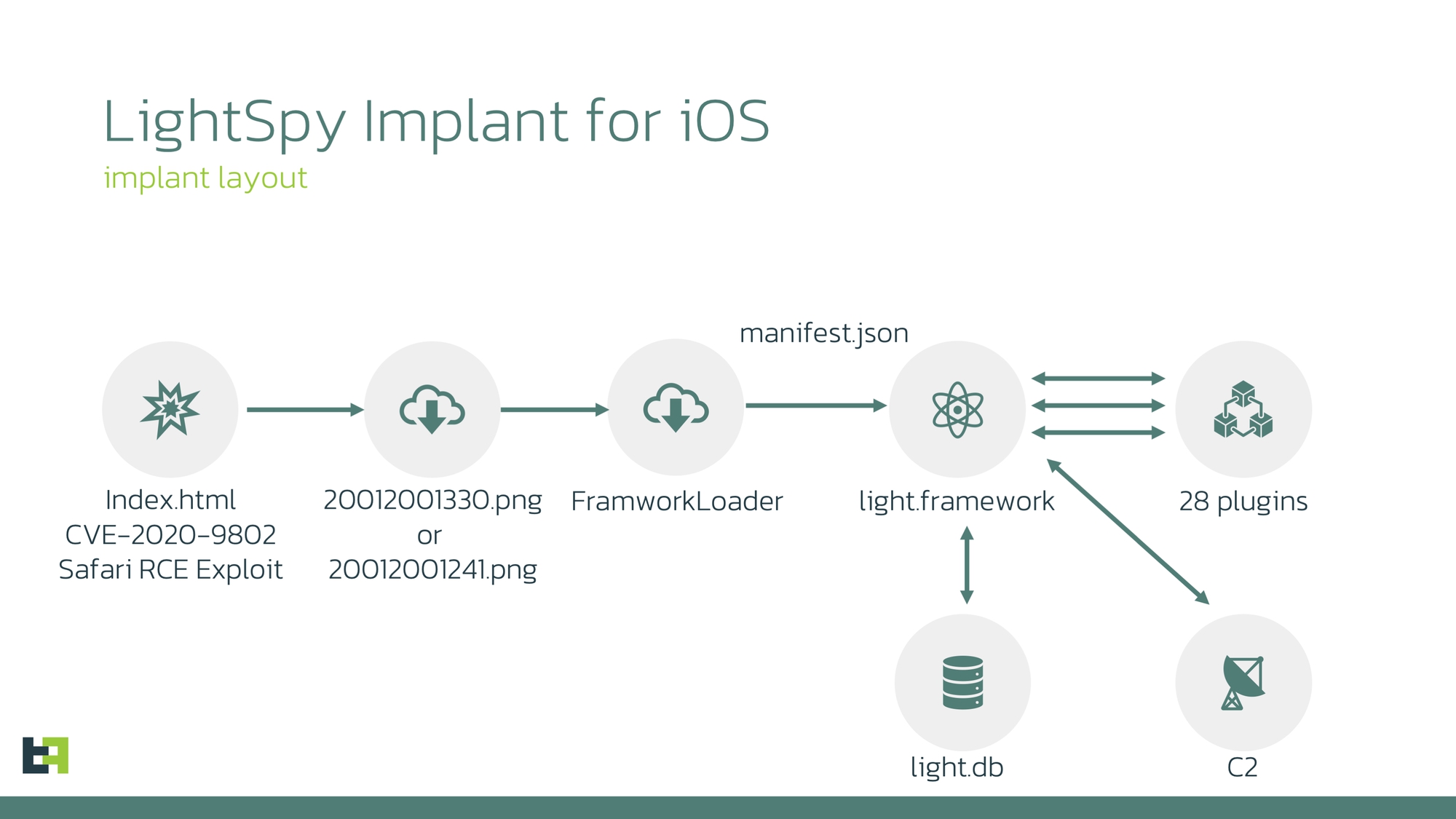 Theo Forbes, phần mềm gián điệp này nhắm vào các phiên bản iOS cũ, chưa được vá của Apple, bằng cách khai thác các lỗ hổng đã được công bố, cụ thể là "lỗ hổng Safari CVE-2020-9802 và CVE-2020-3837".
