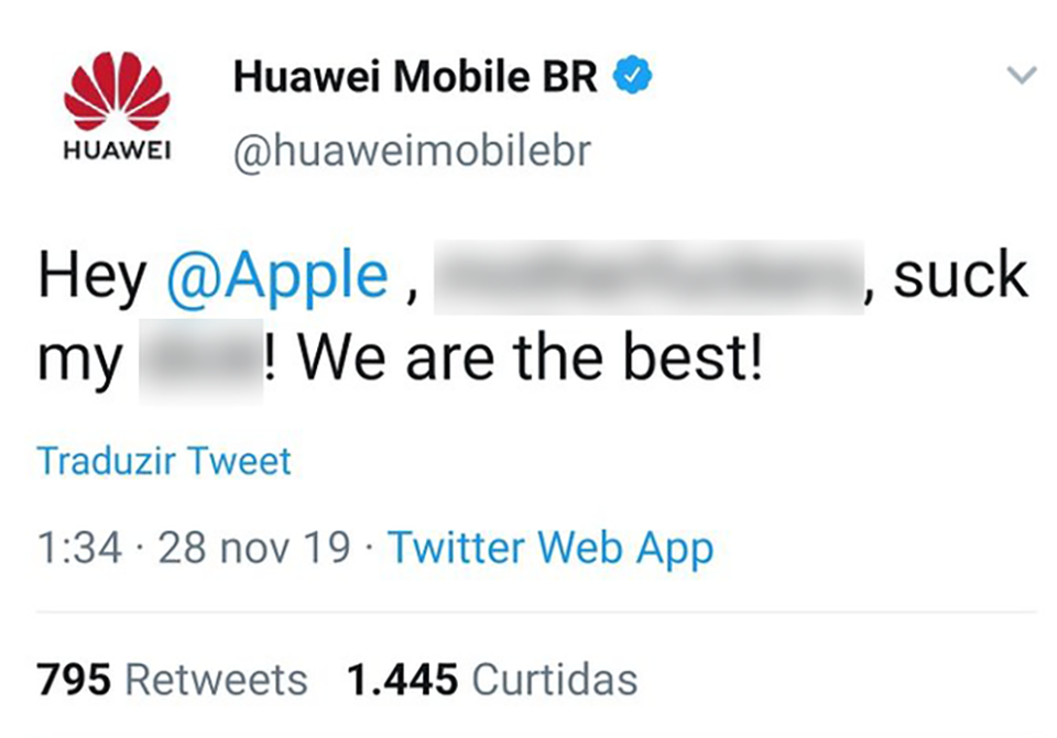 Thông tin này sau đó được gỡ bỏ nhưng nội dung đã lan truyền trên mạng xã hội. Theo đó, Huawei Brazil chế giễu người nghèo Brazil không thể mua điện thoại Huawei. Tiếp sau đó là đoạn tweet chửi bới Apple, kết thúc bằng câu “Chúng tôi là tốt nhất!”.