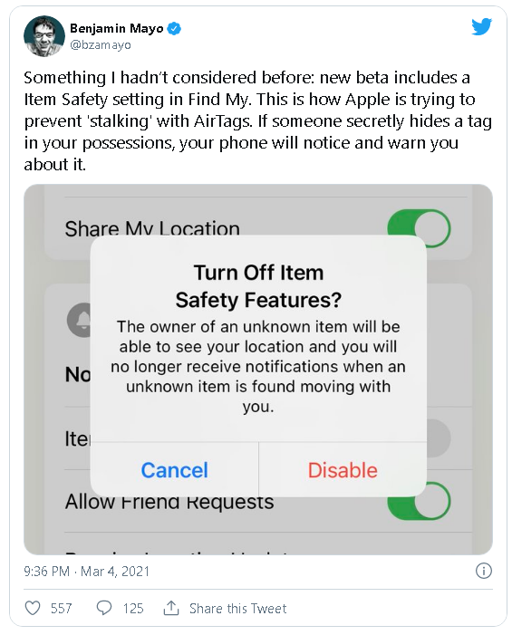 Nhằm tránh để AirTags bị lợi dụng như một thiết bị theo dõi người khác, Apple đã chuẩn bị ra mắt một tính năng đặc biệt. “Item Safety Alerts” là một tính năng được phát hiện trong phiên bản iOS 14.5 beta, sẽ thông báo cho người dùng biết, nếu có một thiết bị ở gần bạn mà nó nghi ngờ là được sử dụng để theo dõi di chuyển của bạn.