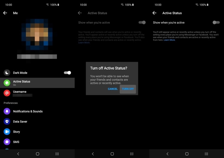 Mở ứng dụng Facebook Messenger, sau đó bấm lên biểu tượng ảnh đại diện ở phía trên góc phải của màn hình chính. Tìm và chọn tùy chọn Active Status (Trạng thái hoạt động). Bây giờ, bạn chỉ cần tắt công tắc nằm bên cạnh tùy chọn Show when you’re active (Hiển thị khi bạn hoạt động).