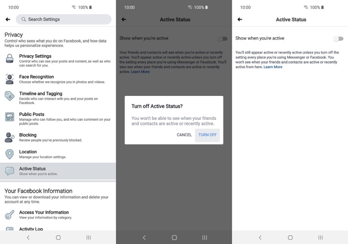 Mở ứng dụng Facebook và bấm nút trình đơn hình ba thanh ngang. Di chuyển xuống dưới và chọn Settings & Privacy (Cài đặt & quyền riêng tư). Chọn Settings (Cài đặt), sau đó cuộn tiếp xuống dưới đến phần Privacy (Quyền riêng tư). Tìm và chọn tùy chọn Active Status (Trạng thái hoạt động), sau đó tắt công tắc nằm bên cạnh tùy chọn Show when you’re active (Hiển thị khi bạn hoạt động).