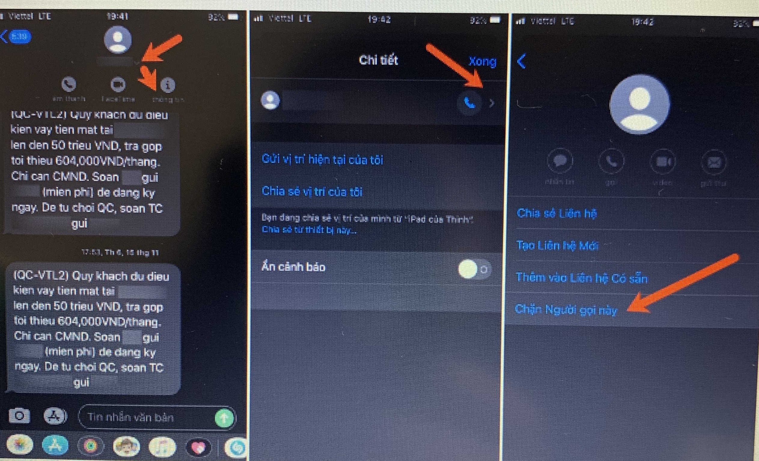 Bên cạnh đó, bạn cũng có thể chặn hoàn toàn tin nhắn từ người gửi cụ thể. Trước hết, mở tin nhắn rác muốn chặn số, chạm vào avatar người gửi ở trên rồi chọn Thông tin. Trong cửa sổ mới hiện lên, chọn vào số liên lạc rồi nhấn Chặn người gọi này.