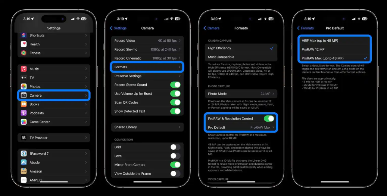 5. Trên iPhone 14 và iPhone 15 Pro và iPhone 15 Pro Max, chạm vào Pro Default và chọn HEIF Max (tối đa 48MP) hoặc ProRAW Max (tối đa 48MP)