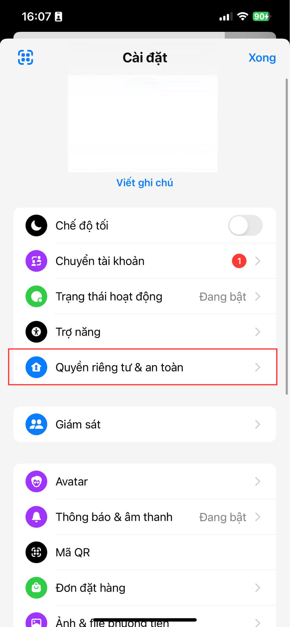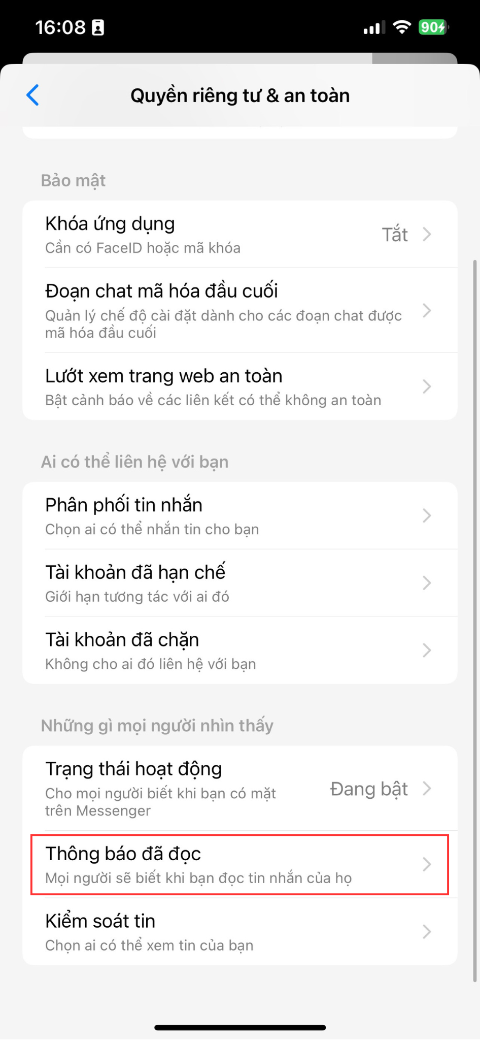 Bước 2: Tìm và chọn mục "Quyền riêng tư & An toàn" tại giao diện hiện ra, nhấn chọn "Thông báo đã đọc".