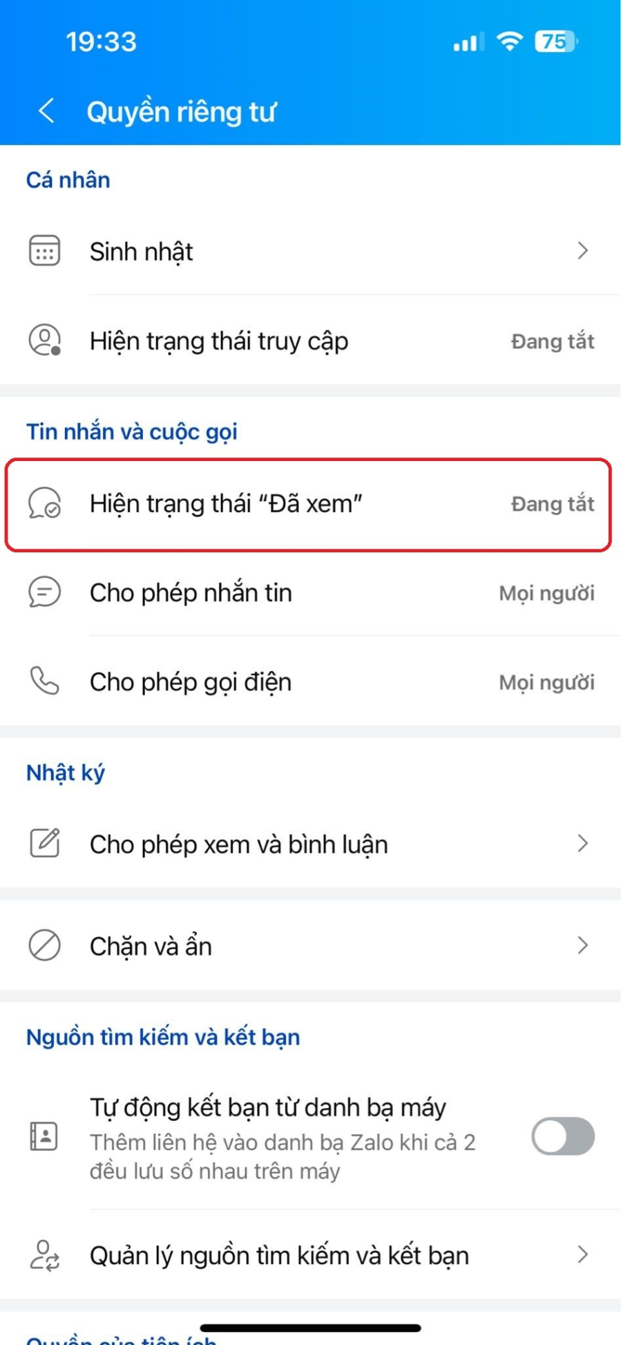 Bước 2: Tại mục Tin nhắn, chọn vào mục "Hiện trạng thái "Đã xem"". Mục này sẽ được bật theo mặc định. Để thay đổi cài đặt, người dùng chỉ cần chuyển trạng thái "Bật (On)" sang trạng thái "Tắt(Off)" .